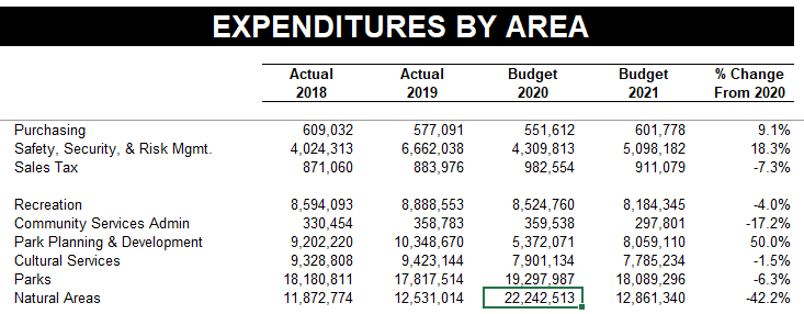 On paper, this certainly makes it look like a large reduction in the total Natural Areas budget from 2020 to 2021. However, if you take out that $10M, the rest of the proposed Natural Areas budget reflects a modest increase from $12.2M in 2020 to $12.8M in 2021. And again, any unspent balance of that $10M will move to the 2021 budget next year.