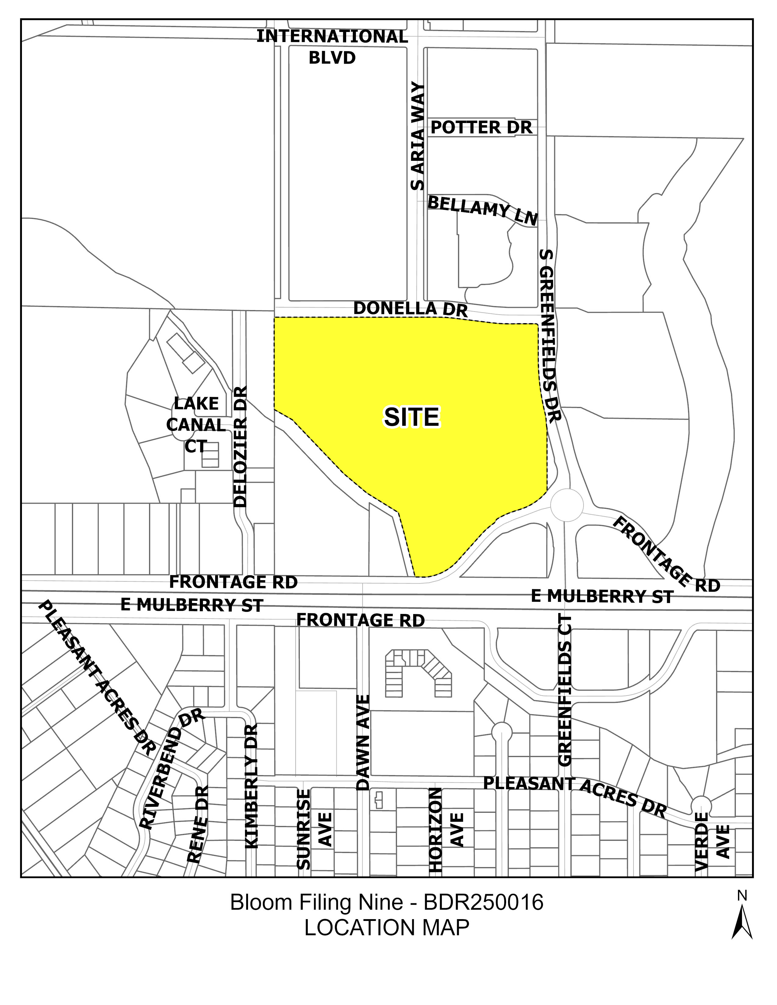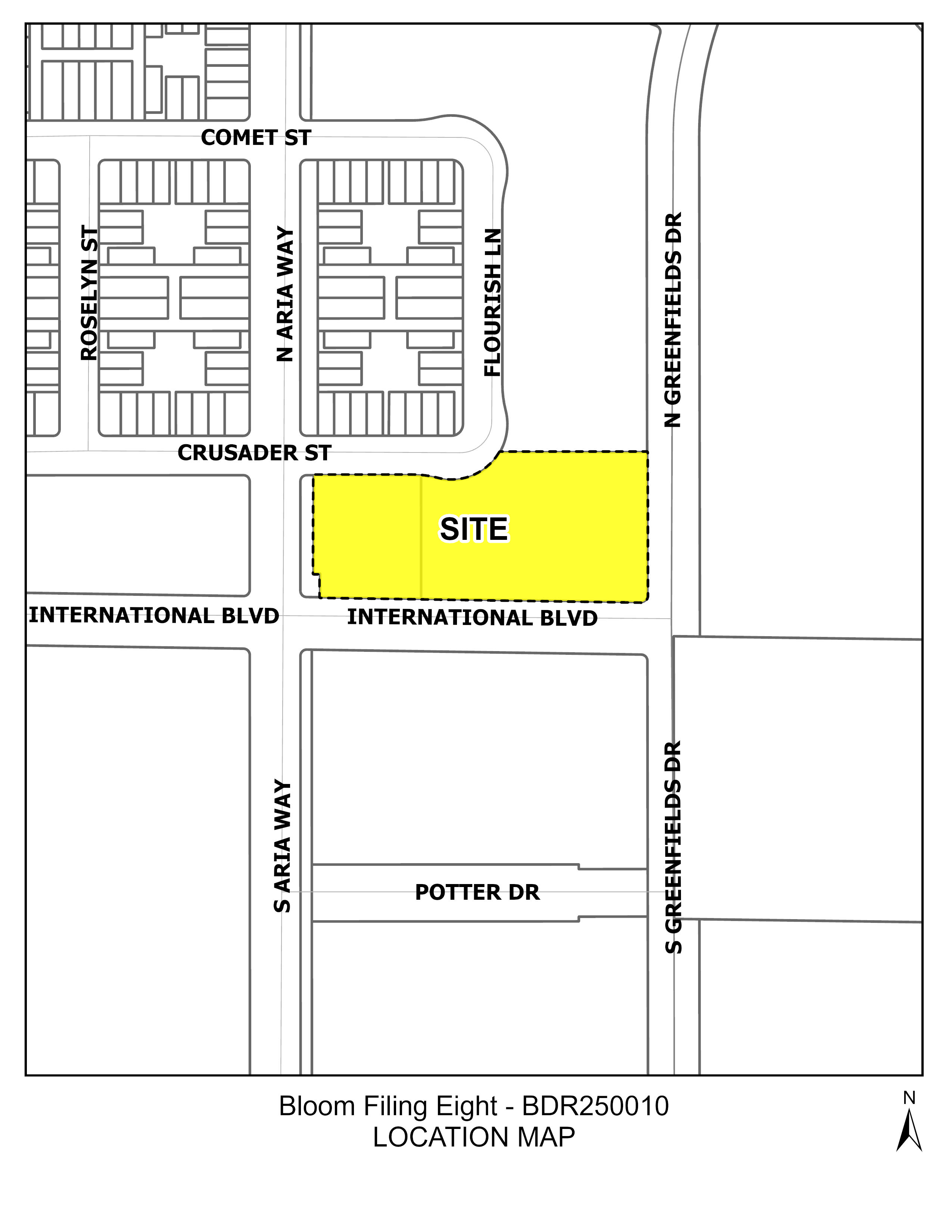 Filing 9 - BDR250016: This filing is currently in the Basic Development Review process with the City. The request includes platting the backbone roadway infrastructure and establishing super-pad sites to support future commercial development. Proposed improvements will extend Aria Way north-south through the site, introduce a new east-west street (Bloom Boulevard), and create a central open space envisioned as an active community gathering area. The design emphasizes a safe, walkable commercial core with multimodal access, including traffic calming features, regional bike trail connections, and a proposed bus stop.